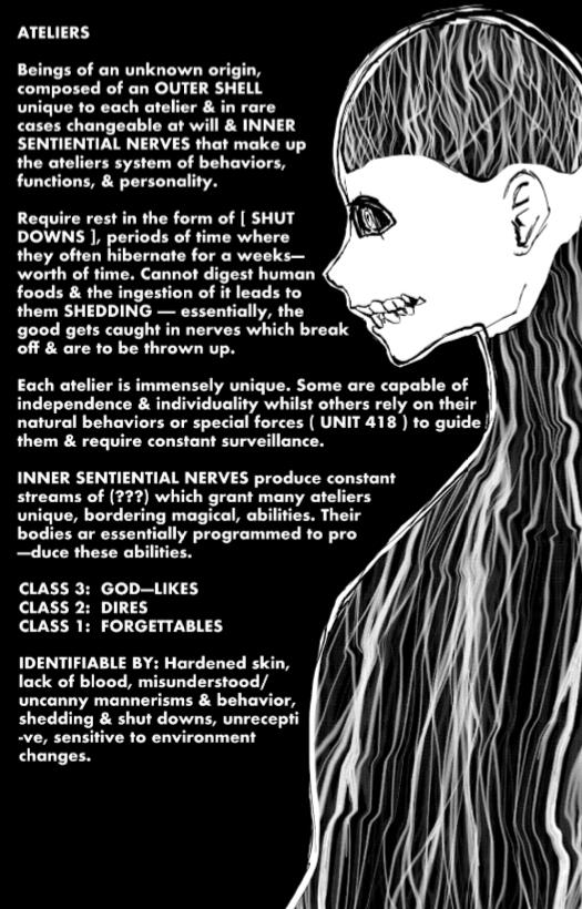 ... ATELIERS are a species that come from time-old, but are looked down upon within THE DISTRICT due to their nature being more questions than answers; while what you see of them looks human, it’s simply considered an outer shell, and seems to serve merely as some form of aesthetic purpose to fit-in with their surroundings. In some cases, these shellings are distorted, resulting in a form of uncanny valley. All are composed of inner working beings that operate individually to come together & form a single being, producing magic-output and a human persona ‘like a workshop’. They’re also regarded as Fake humans & Vessels. Each Atelier has their own forms of unique and limited magic; with there being 3 different classes (Class 1/2/3) to determine an Atelier’s strength and cause for concern.... THE BLACK ROT is a disease which distorts the biological makeup and works the ‘INNER-SENTIENTIAL NERVES’ to their very core, resulting in higher magic output whilst also shortening lifespan and disfiguring & warping the outer shell. It often works to alter that of the ateliers behaviors, including personality, with the most common changes being brain-deadness, amnesia, aggression/volatility, and paranoia. Over time, the outer shell will begin to crack & break until reduced to mere exposed nerves, which then go on to whither & die from exposure to the elements due to Ateliers' delicate internal structure.... Because of the effect of ateliers on the District and their high density among the population, many humans end up born with strange effects. These are often referred to as MUDCHILDREN.